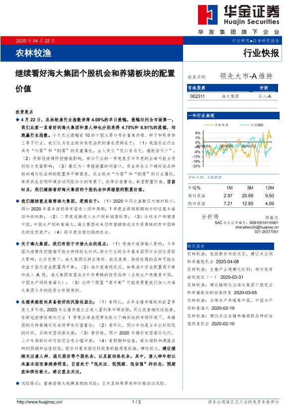 【华金证券】【20200422】20200422-华金证券-农林牧渔行业快报:继续看好海大集团个股机会和养猪板块的配置价值-3页