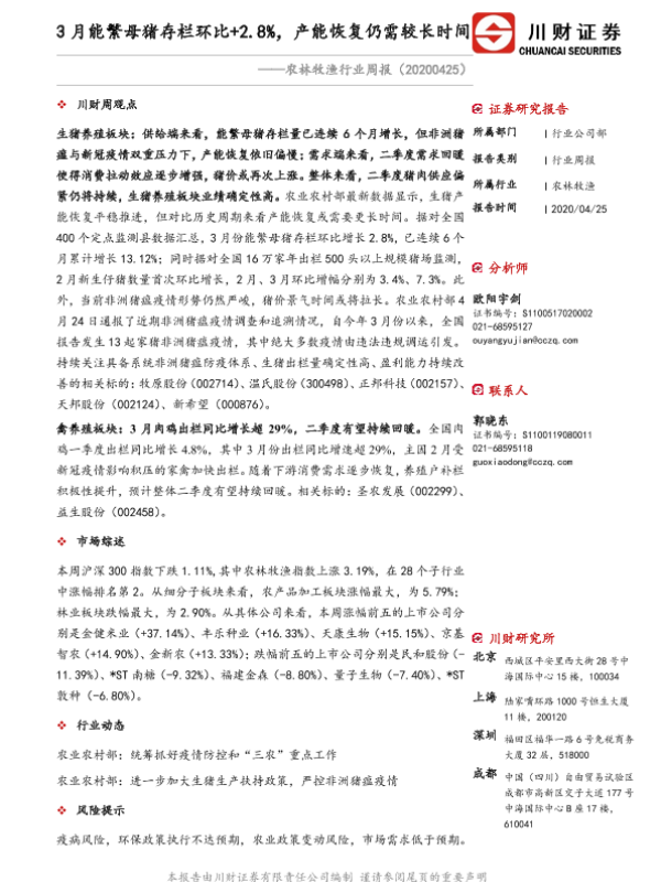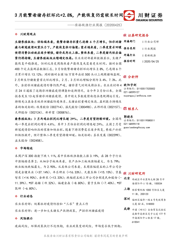 【川财证券】【20200425】20200425-川财证券-农林牧渔行业周报:3月能繁母猪存栏环比+2.8%,产能恢复仍需较长时间-13页