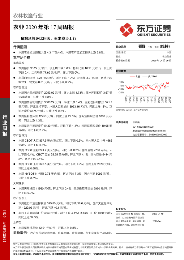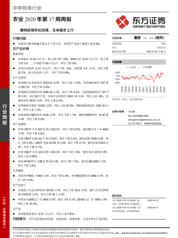 【东方证券】【20200426】农业2020年第17周周报:猪鸡延续环比回落,玉米稳步上行-16页