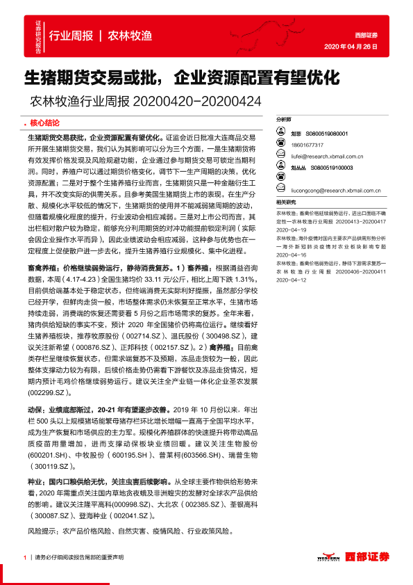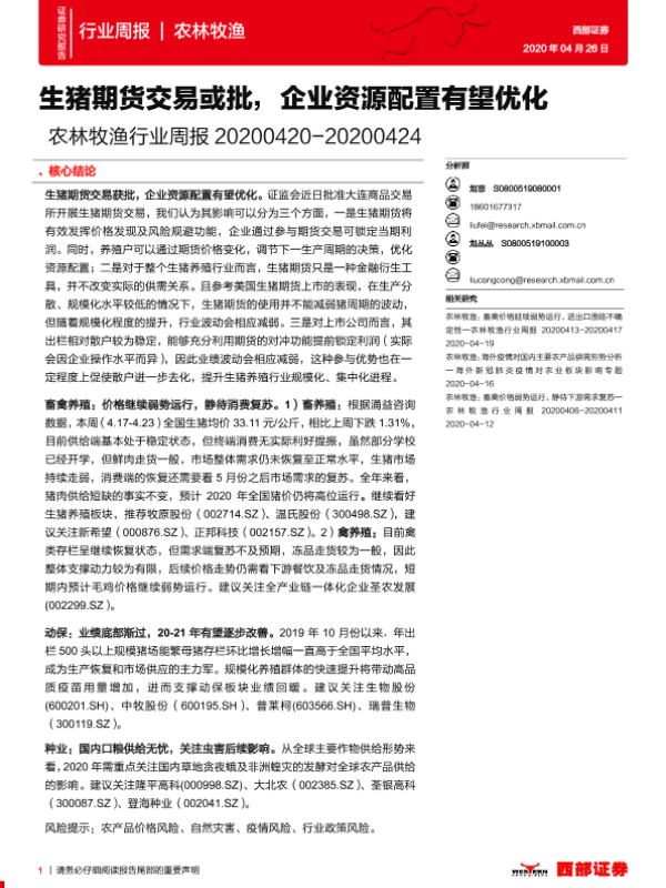【西部证券】【20200426】农林牧渔行业周报:生猪期货交易或批,企业资源配置有望优化-13页