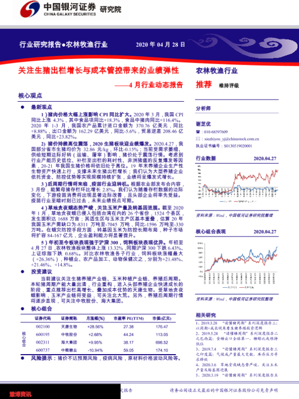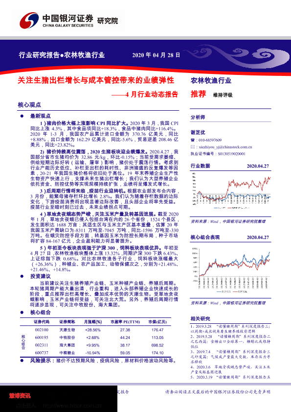 【银河证券】【20200428】20200428-中国银河-农林牧渔4月行业动态报告:关注生猪出栏增长与成本管控带来的业绩弹性-29页