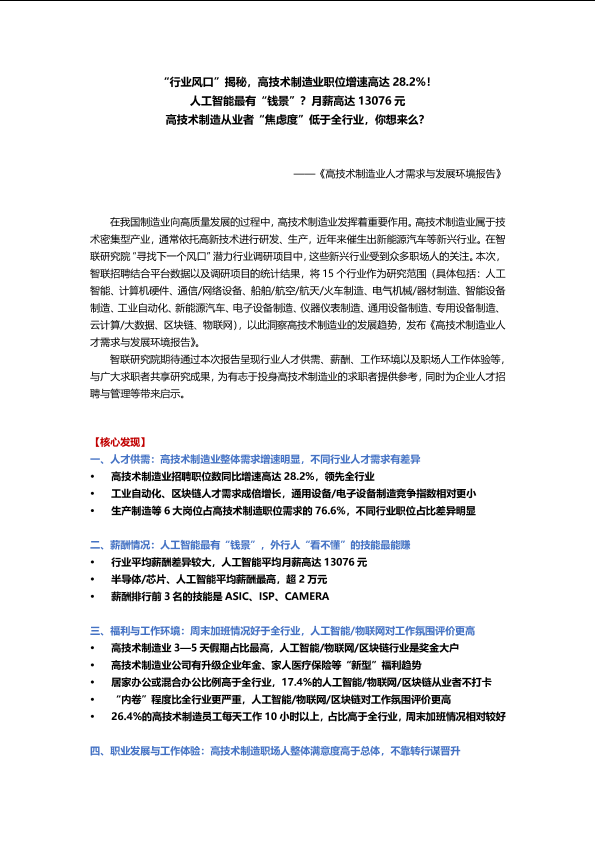 人才需求 工作环境 职业发展 薪酬情况 高技术制造业