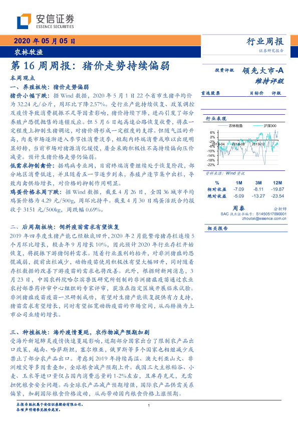 【安信证券】【20200505】20200505-安信证券-农林牧渔第16周周报:猪价走势持续偏弱-25页