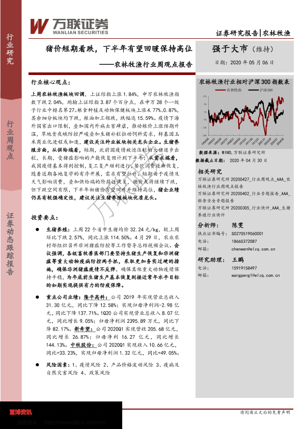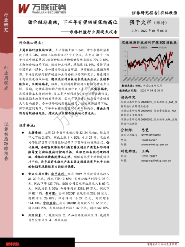 【万联证券】【20200506】20200506-万联证券-农林牧渔行业周观点报告:猪价短期看跌,下半年有望回暖保持高位-18页