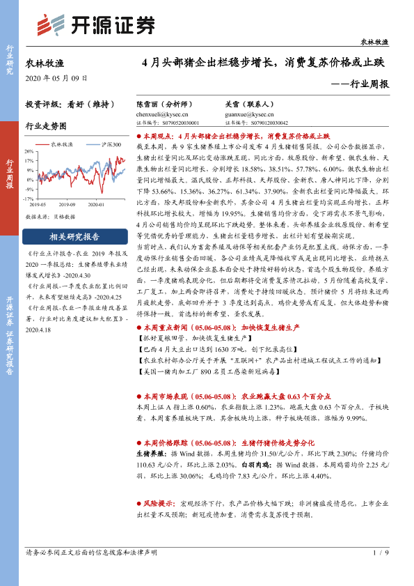 【开源证券】【20200509】20200509-开源证券-农林牧渔行业周报:4月头部猪企出栏稳步增长,消费复苏价格或止跌-9页