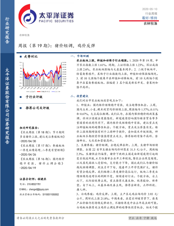 【太平洋证券】【20200510】20200510-太平洋-农林牧渔行业周报(第19期):猪价短调,鸡价反弹-15页