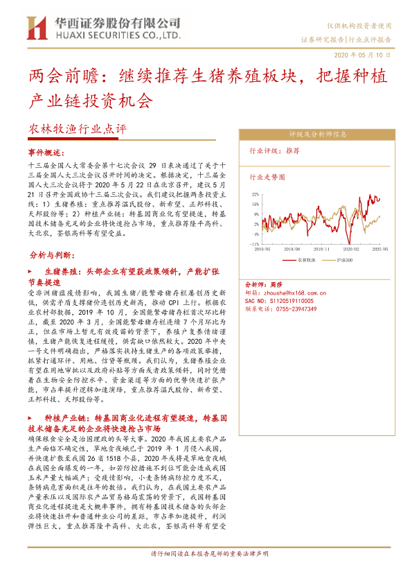 【华西证券】【20200510】20200510-华西证券-农林牧渔行业点评:两会前瞻:继续推荐生猪养殖板块,把握种植产业链投资机会-11页