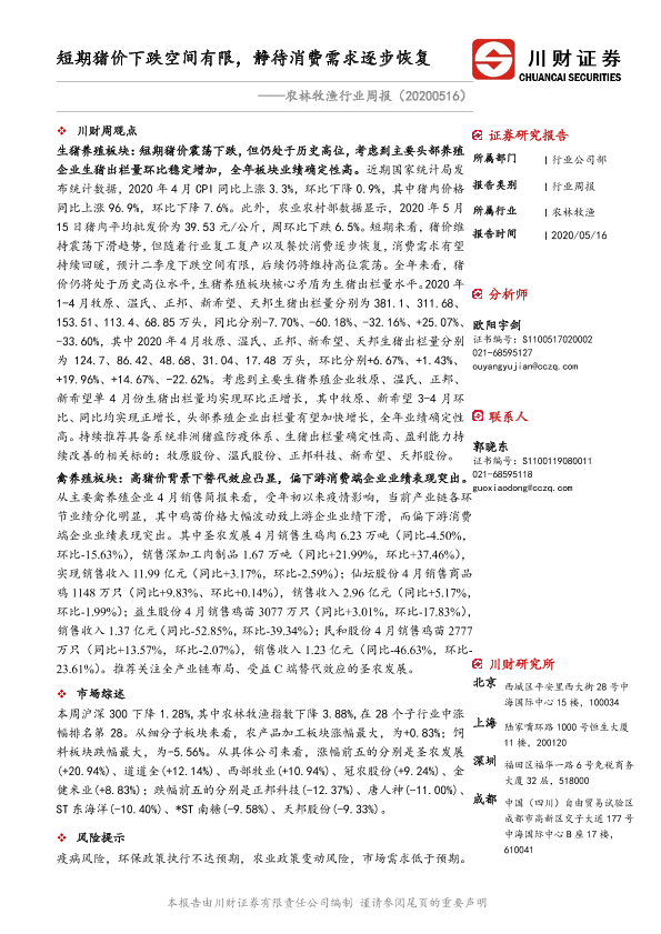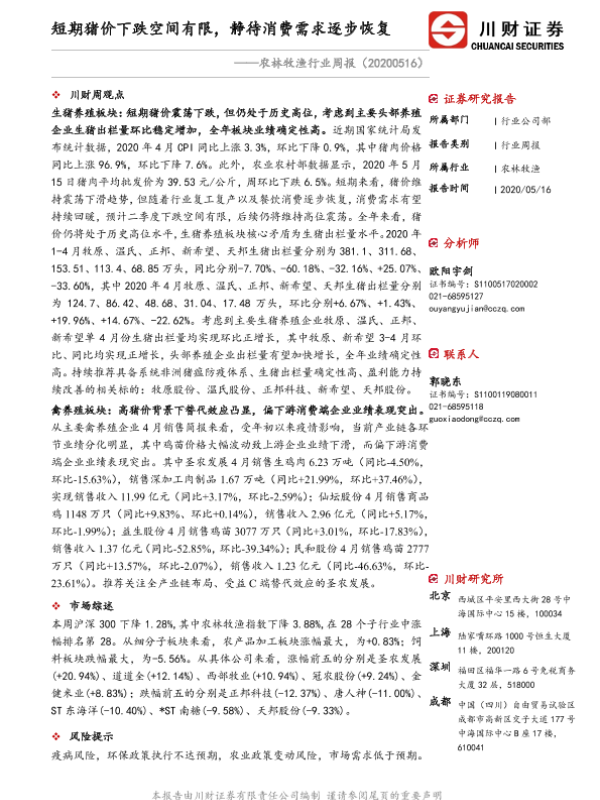 【川财证券】【20200516】20200516-川财证券-农林牧渔行业周报:短期猪价下跌空间有限,静待消费需求逐步恢复-13页