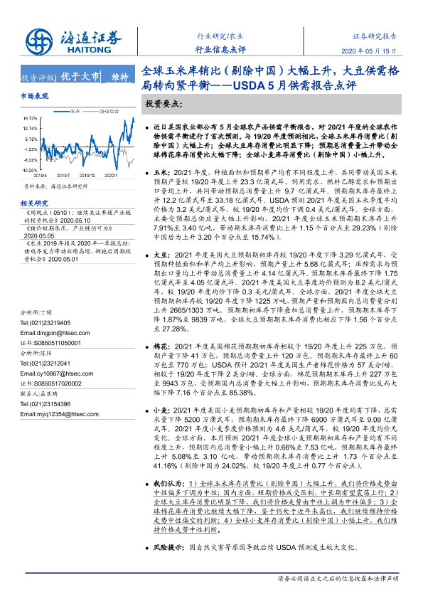 【海通证券】【20200515】20200515-海通证券-农业行业信息点评:USDA5月供需报告点评-全球玉米库销比(剔除中国)大幅上升,大豆供需格局转向紧平衡-6页