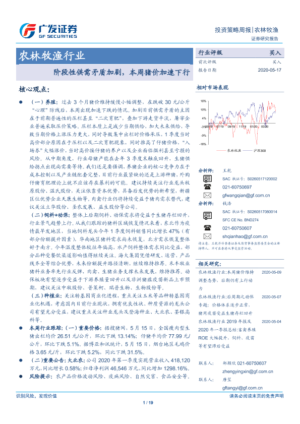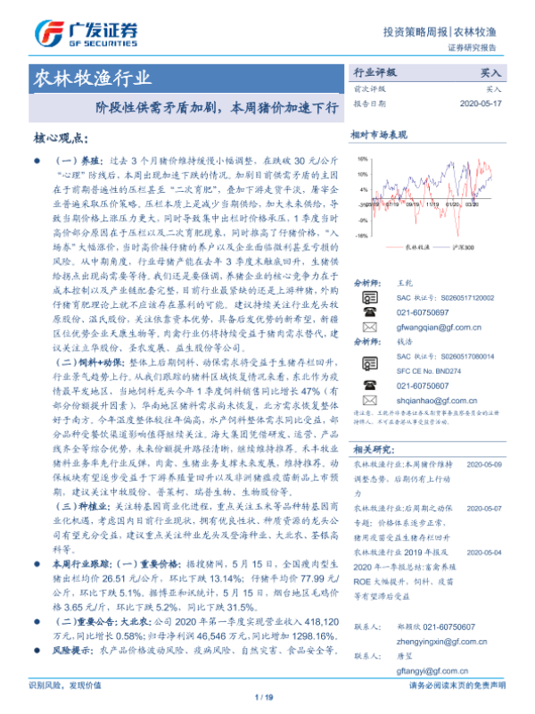 【广发证券】【20200517】20200517-广发证券-农林牧渔行业投资策略周报:阶段性供需矛盾加剧,本周猪价加速下行-19页