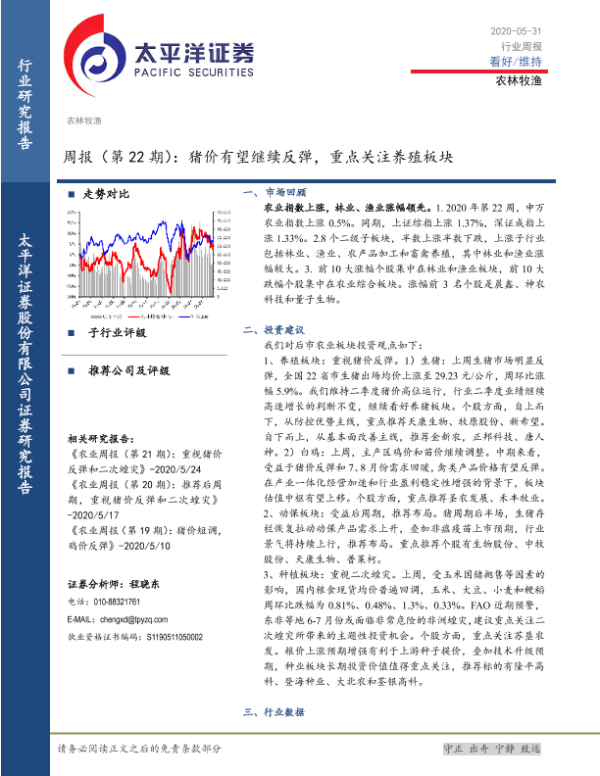 【太平洋证券】【20200531】20200531-太平洋-农林牧渔周报(第22期):猪价有望继续反弹,重点关注养殖板块-15页