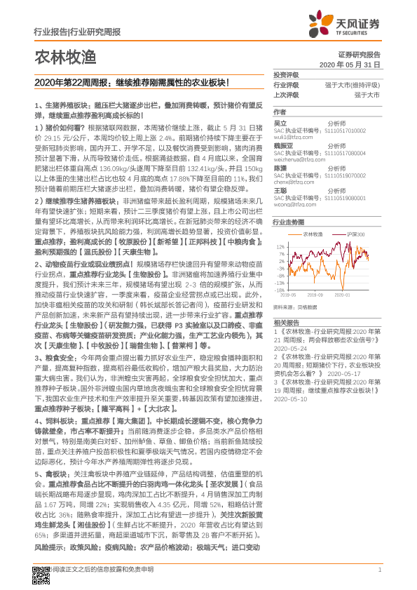 【天风证券】【20200531】20200531-天风证券-农林牧渔2020年第22周周报:继续推荐刚需属性的农业板块!-15页