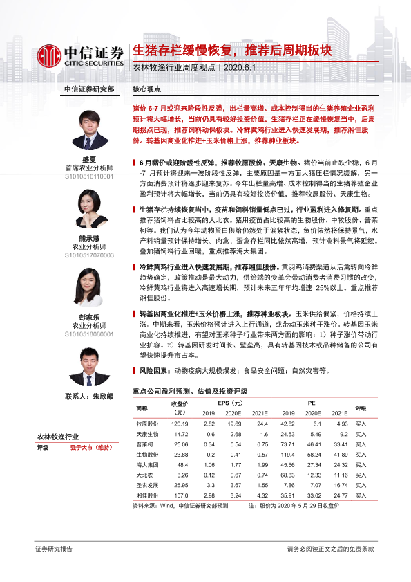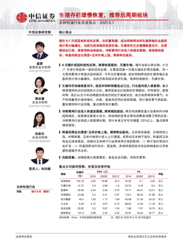 【中信证券】【20200601】农林牧渔行业周度观点:生猪存栏缓慢恢复,推荐后周期板块-8页