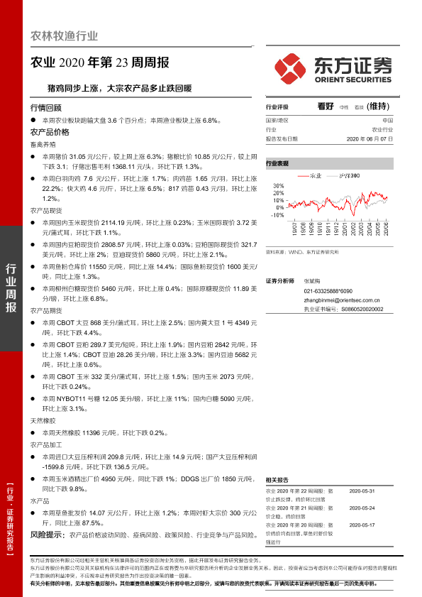 【东方证券】【20200607】农业2020年第23周周报:猪鸡同步上涨,大宗农产品多止跌回暖-16页