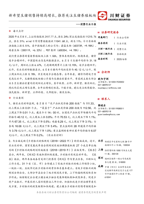 【川财证券】【20200608】消费行业日报:新希望生猪销售持续高增长,推荐关注生猪养殖板块-3页
