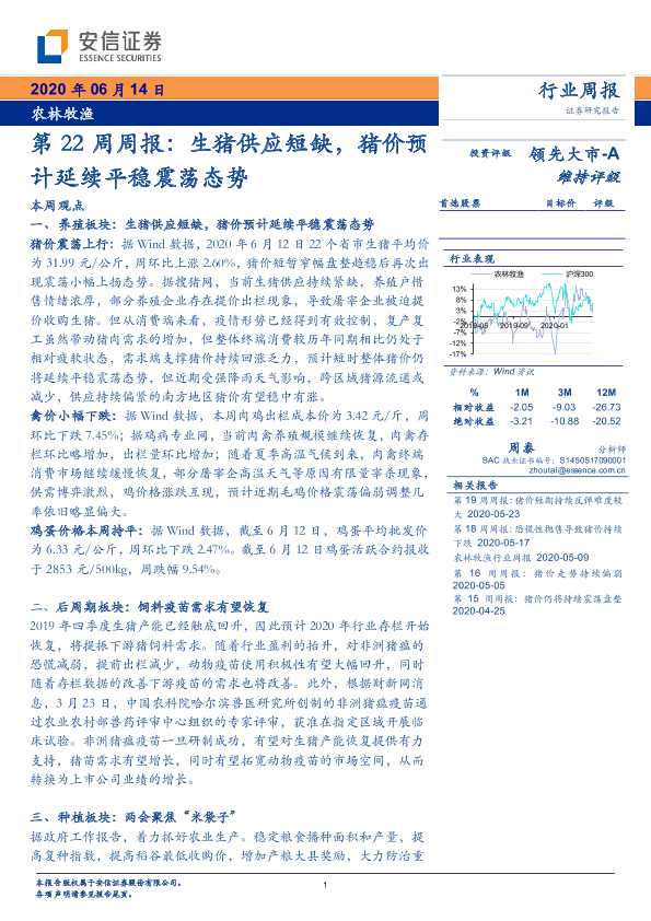 【安信证券】【20200614】农林牧渔行业第22周周报:生猪供应短缺,猪价预计延续平稳震荡态势-23页