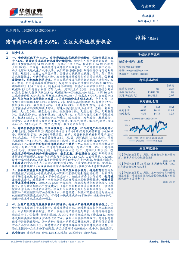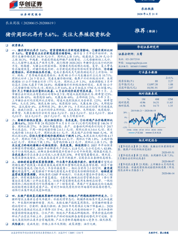 【华创证券】【20200621】20200621-华创证券-农业周报:猪价周环比再升5.6%,关注大养殖投资机会-45页