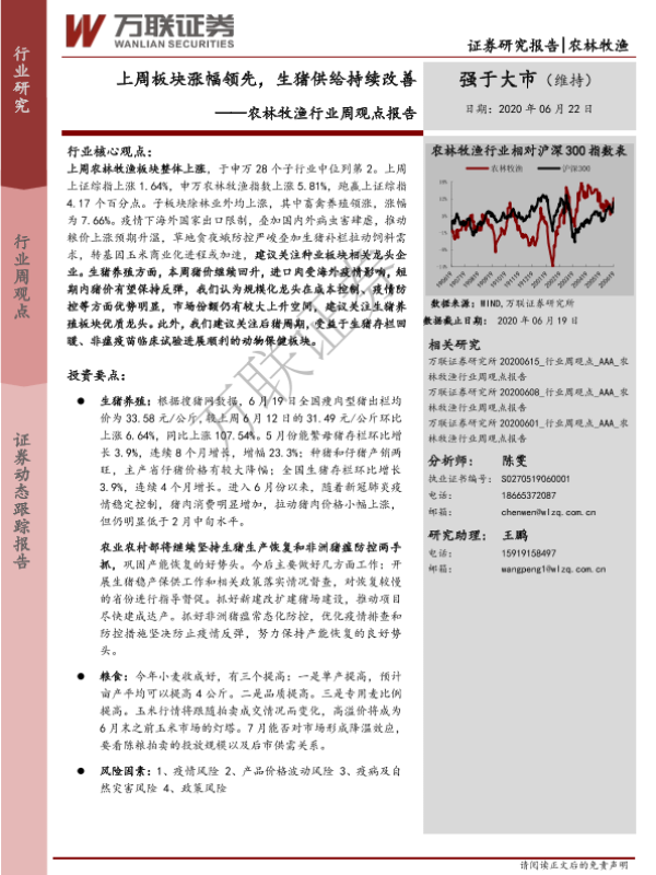 【万联证券】【20200622】20200622-万联证券-农林牧渔行业周观点报告:上周板块涨幅领先,生猪供给持续改善-19页