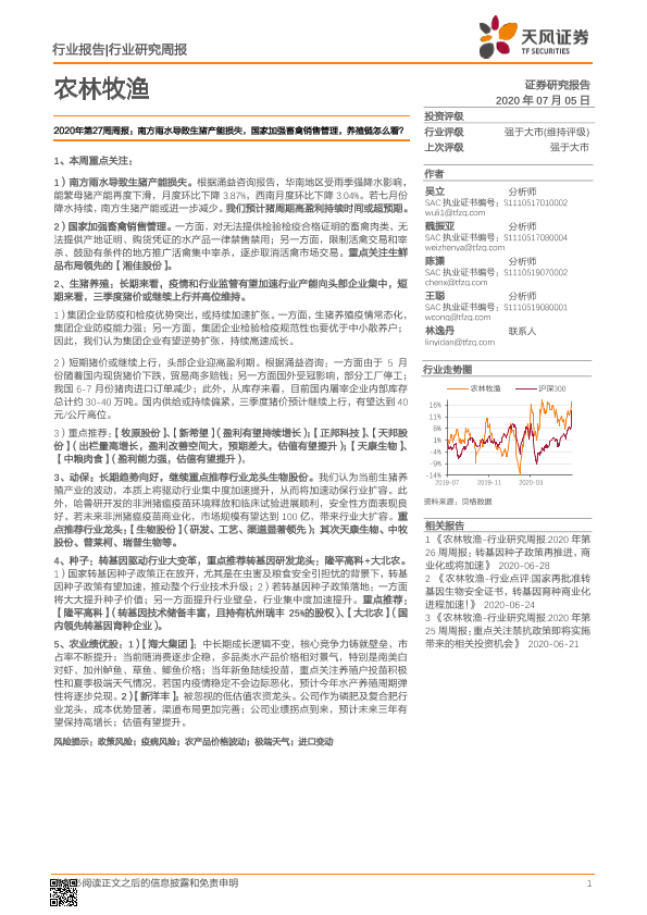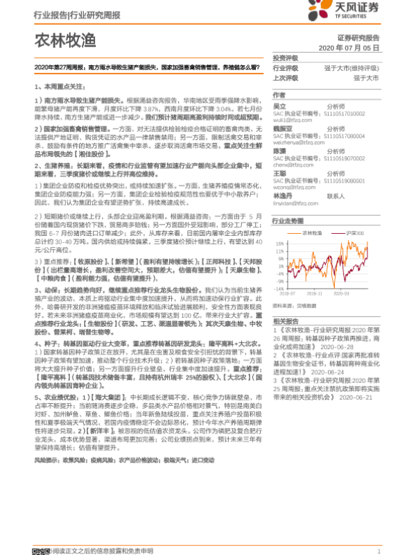 【天风证券】【20200705】20200705-天风证券-农林牧渔2020年第27周周报:南方雨水导致生猪产能损失,国家加强畜禽销售管理,养殖链怎么看?-15页