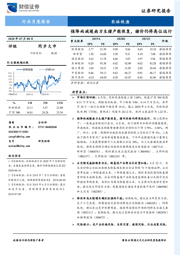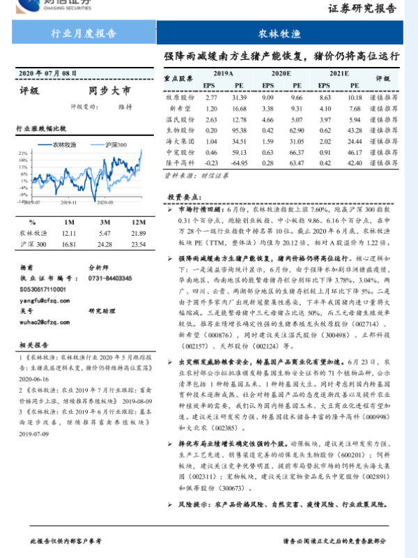 【财信证券】【20200708】20200708-财信证券-农林牧渔行业月度报告:强降雨减缓南方生猪产能恢复,猪价仍将高位运行-14页