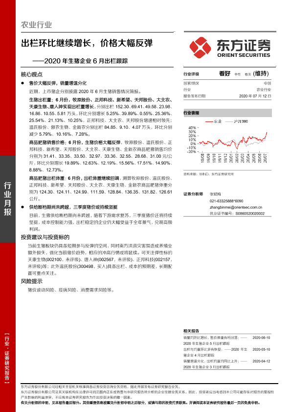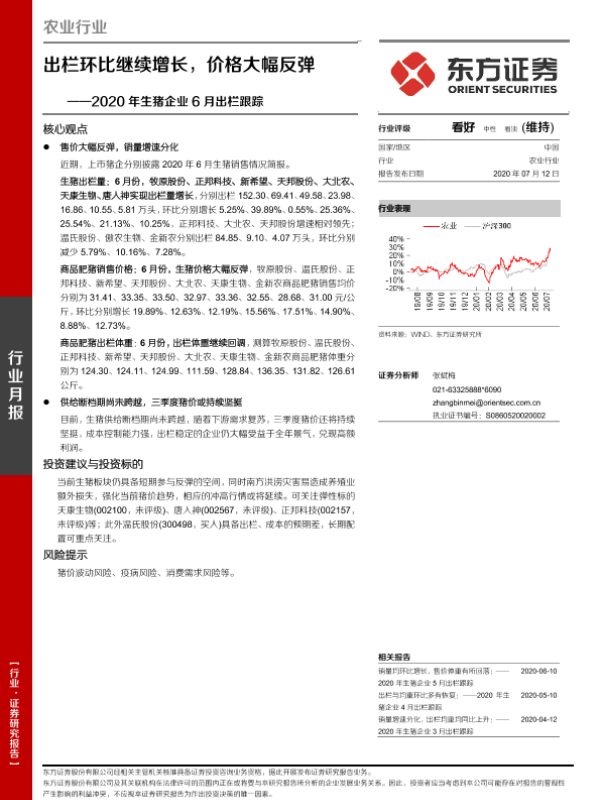 【东方证券】【20200712】农业行业2020年生猪企业6月出栏跟踪:出栏环比继续增长,价格大幅反弹-7页