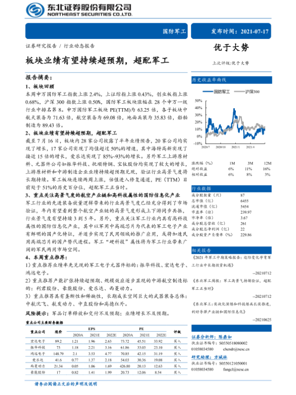 【东北证券】【20210717】国防军工行业:板块业绩有望持续超预期,超配军工-21页