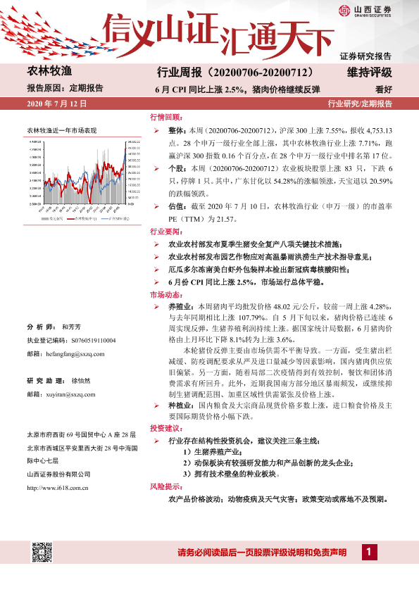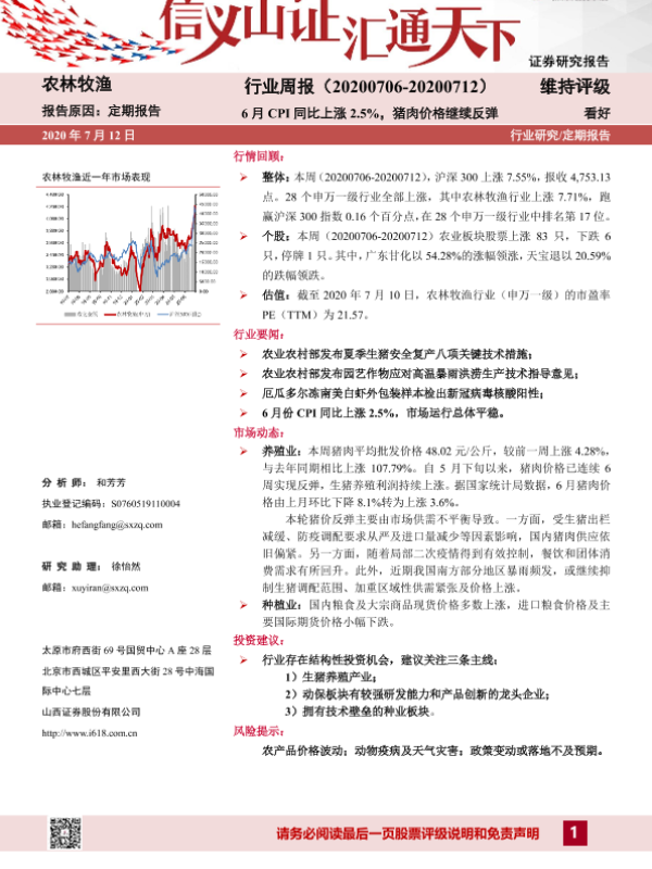 【山西证券】【20200712】20200712-山西证券-农林牧渔行业周报:6月CPI同比上涨2.5%,猪肉价格继续反弹-16页