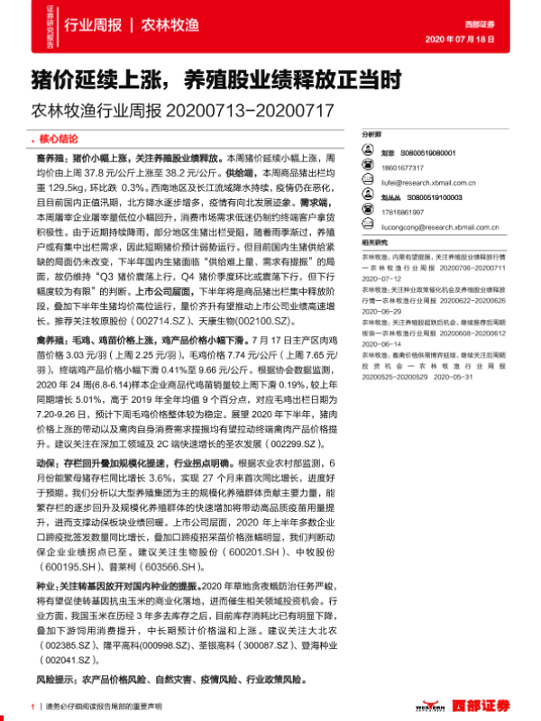【西部证券】【20200718】20200718-西部证券-农林牧渔行业周报:猪价延续上涨,养殖股业绩释放正当时-14页