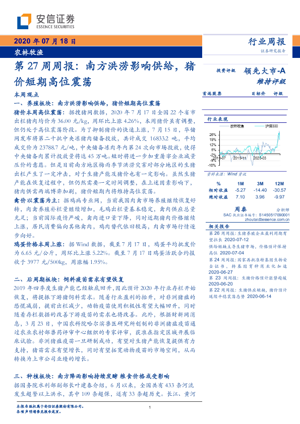 【安信证券】【20200718】农林牧渔行业第27周周报:南方洪涝影响供给,猪价短期高位震荡-23页