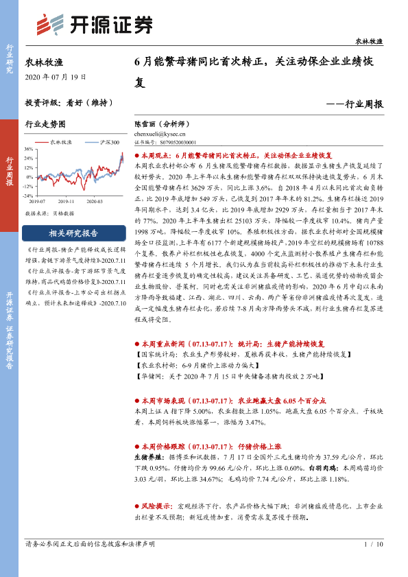 【开源证券】【20200719】20200719-开源证券-农林牧渔行业周报:6月能繁母猪同比首次转正,关注动保企业业绩恢复-10页