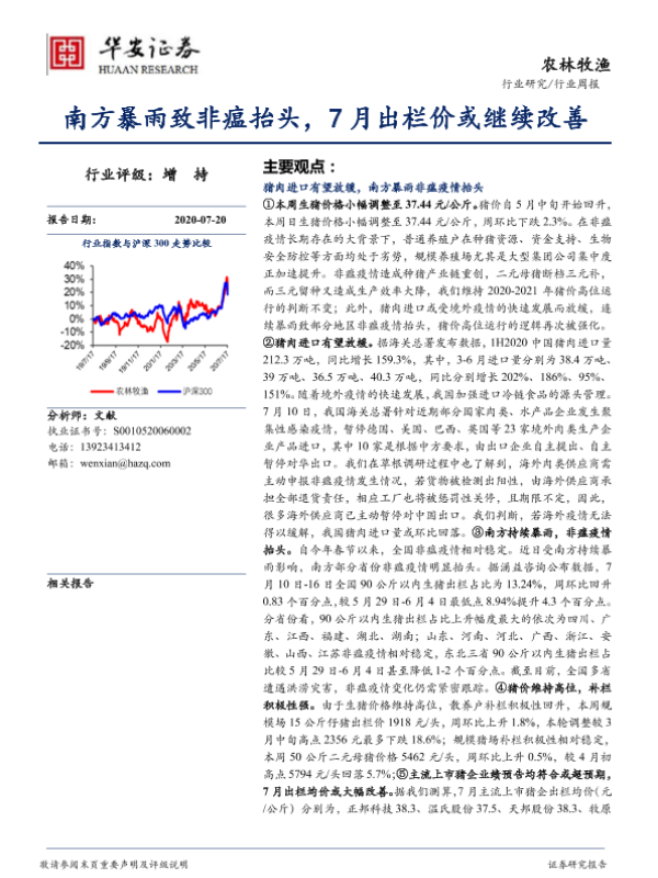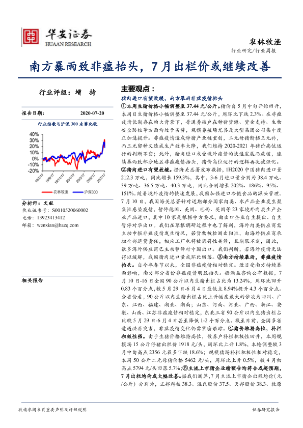 【华安证券】【20200720】20200720-华安证券-农林牧渔行业周报:南方暴雨致非瘟抬头,7月出栏价或继续改善-36页