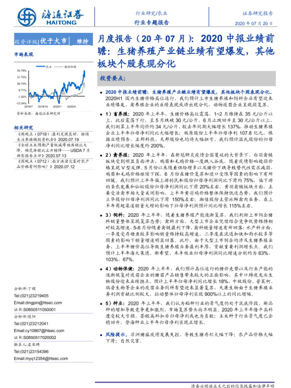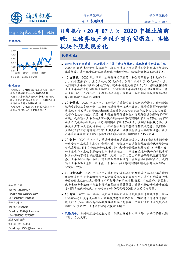 【海通证券】【20200720】2020中报业绩前瞻:生猪养殖产业链业绩有望爆发,其他板块个股表现分化-13页