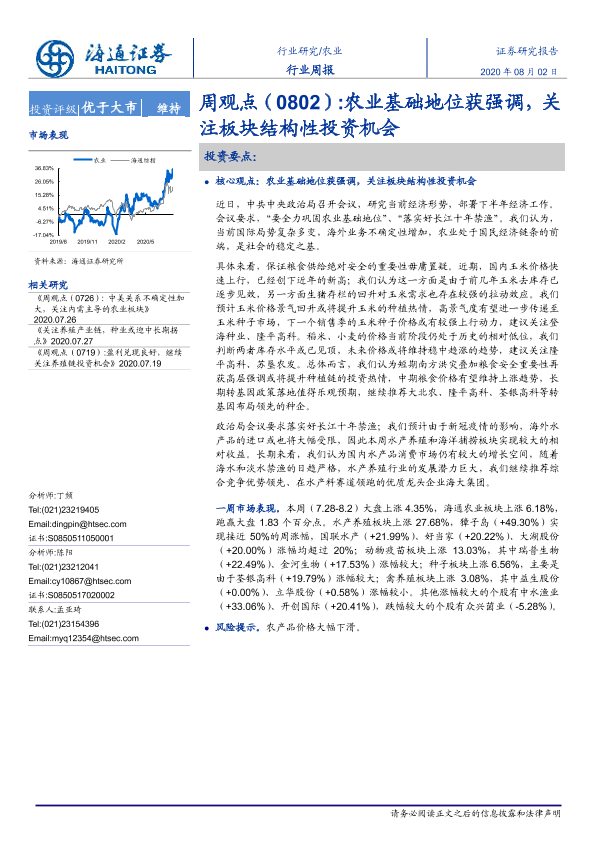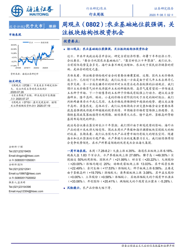 【海通证券】【20200802】20200802-海通证券-农业周观点:农业基础地位获强调,关注板块结构性投资机会-4页