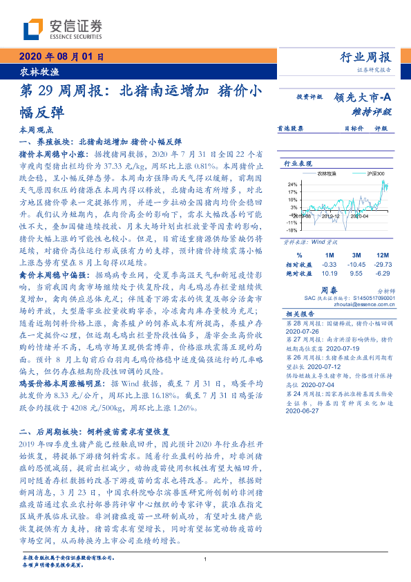 【安信证券】【20200801】农林牧渔第29周周报:北猪南运增加 猪价小幅反弹-22页