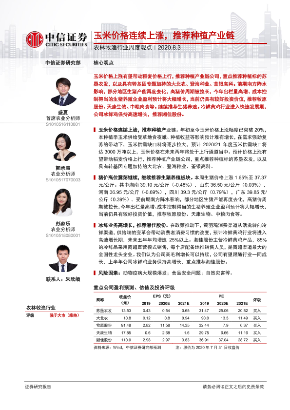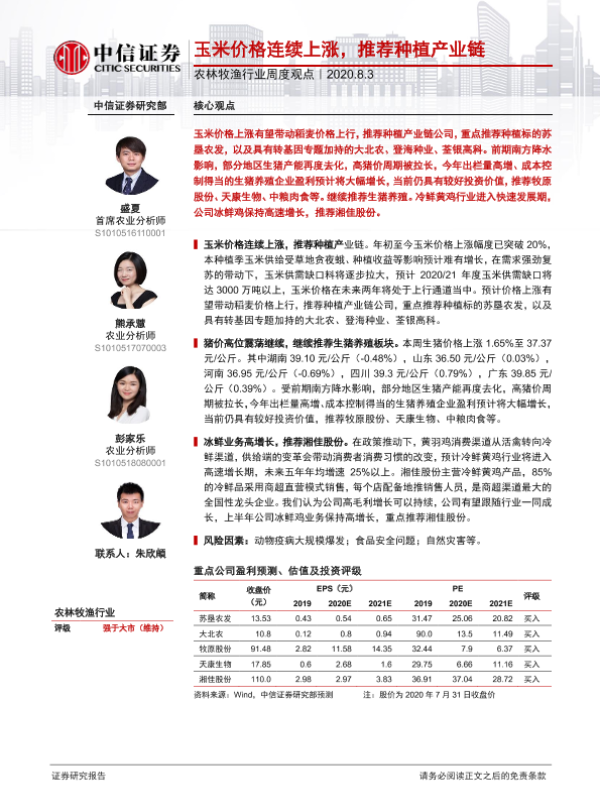 【中信证券】【20200803】20200803-中信证券-农林牧渔行业周度观点:玉米价格连续上涨,推荐种植产业链-8页
