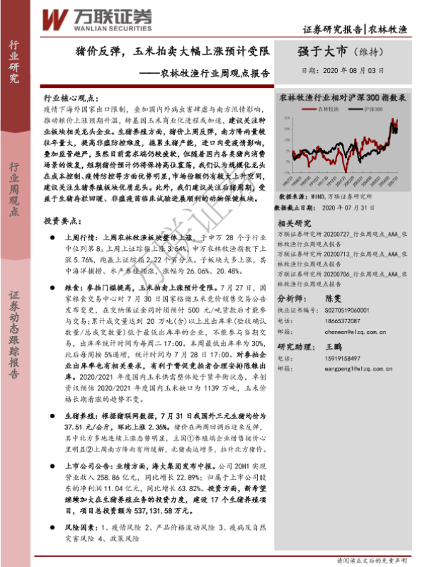 【万联证券】【20200803】20200803-万联证券-农林牧渔行业周观点报告:猪价反弹,玉米拍卖大幅上涨预计受限-17页