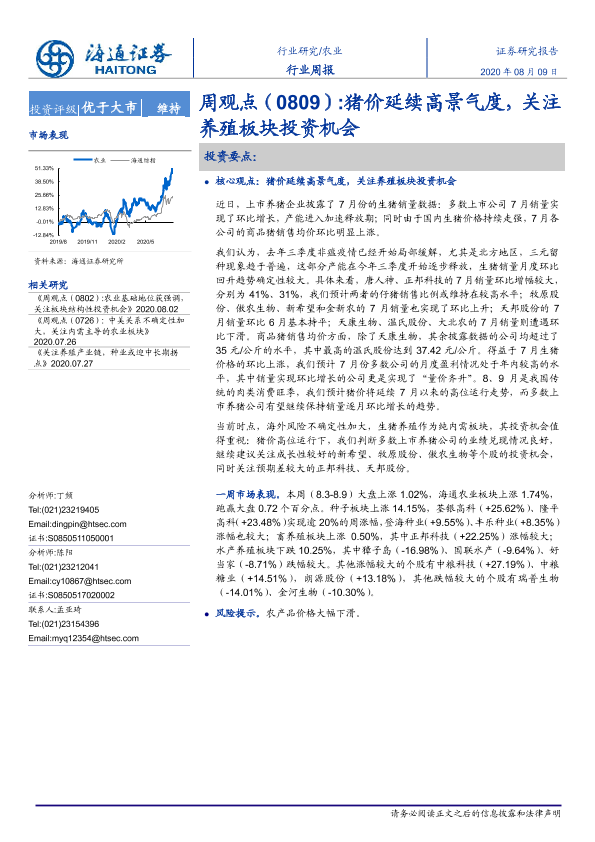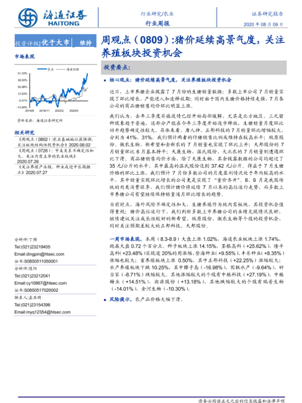 【海通证券】【20200809】20200809-海通证券-农业行业周观点:猪价延续高景气度,关注养殖板块投资机会-3页