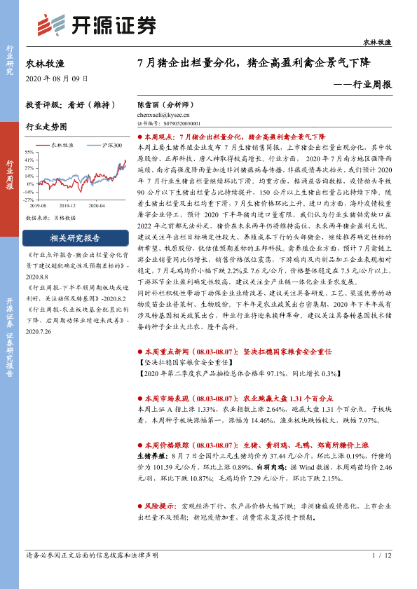 【开源证券】【20200809】农林牧渔行业周报:7月猪企出栏量分化,猪企高盈利禽企景气下降-12页