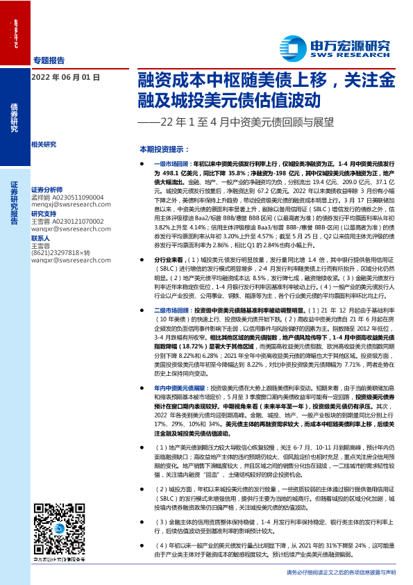 【申万宏源】【20220601】22年1至4月中资美元债回顾与展望:融资成本中枢随美债上移,关注金融及城投美元债估值波动-24页