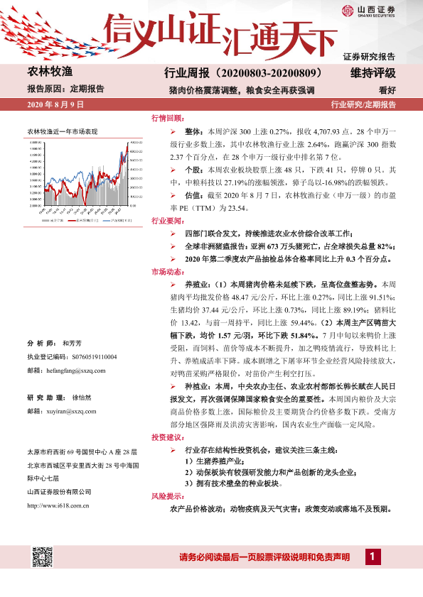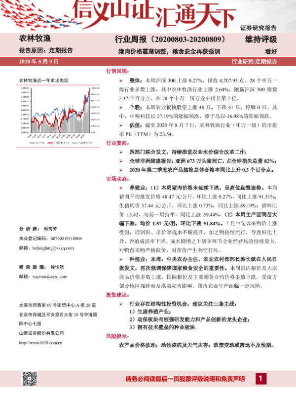 【山西证券】【20200809】20200809-山西证券-农林牧渔行业周报:猪肉价格震荡调整,粮食安全再获强调-14页