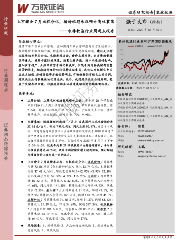 【万联证券】【20200810】20200810-万联证券-农林牧渔行业周观点报告:上市猪企7月出栏分化,猪价短期承压预计高位震荡-18页