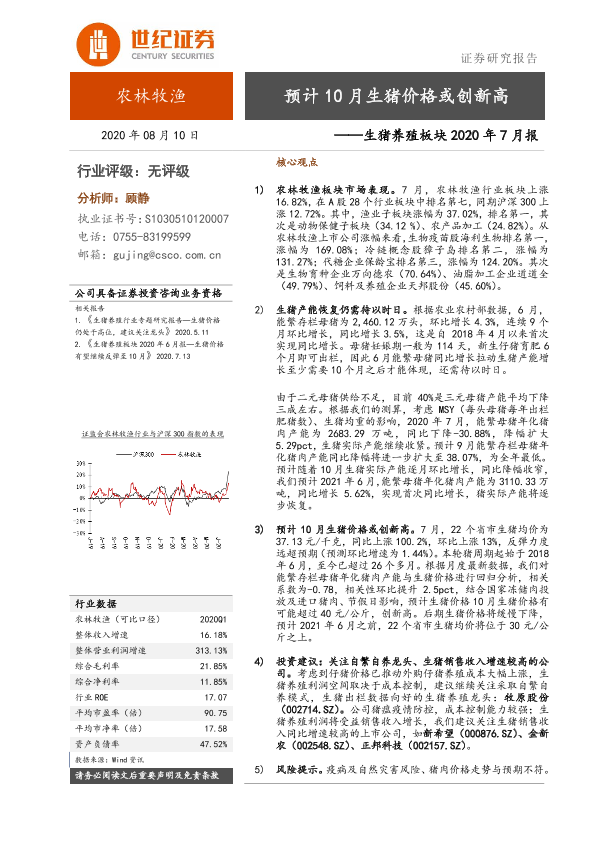 【世纪证券】【20200810】生猪养殖板块2020年7月报:预计10月生猪价格或创新高-18页