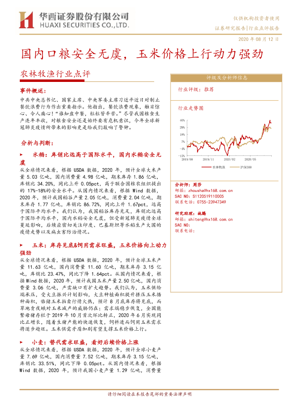 【华西证券】【20200812】20200812-华西证券-农林牧渔行业点评报告:国内口粮安全无虞,玉米价格上行动力强劲-4页