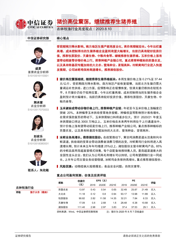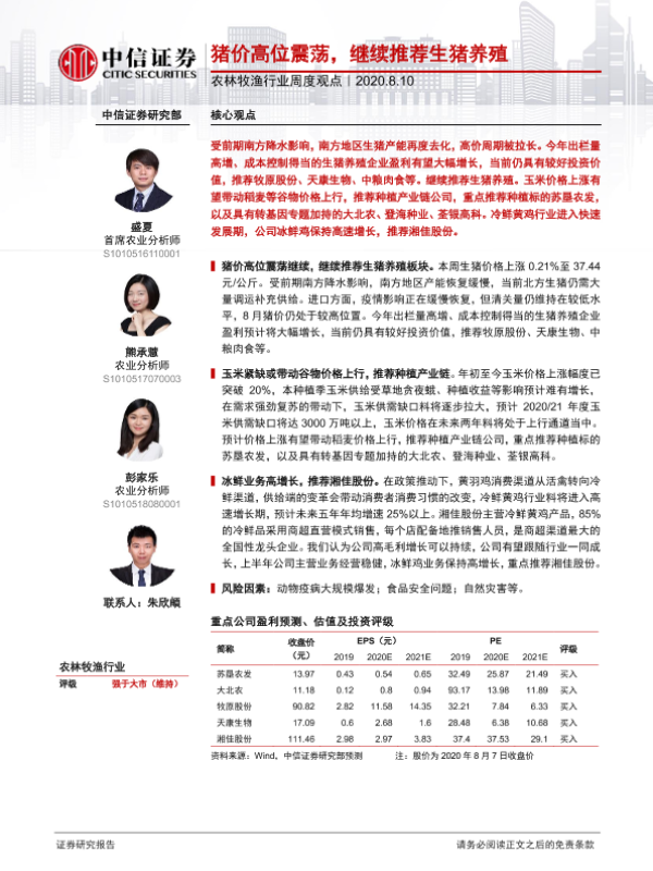 【中信证券】【20200810】20200810-中信证券-农林牧渔行业周度观点:猪价高位震荡,继续推荐生猪养殖-8页