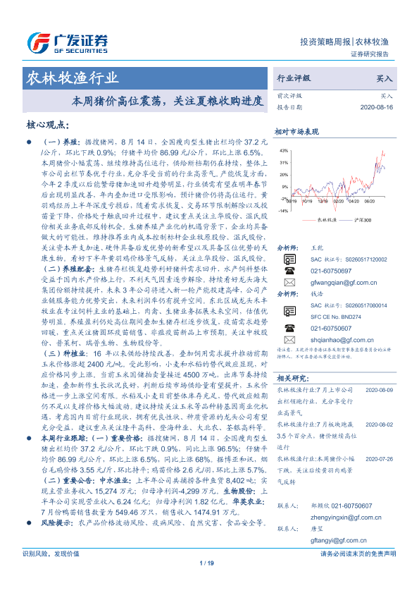 【广发证券】【20200816】20200816-广发证券-农林牧渔行业投资策略周报:本周猪价高位震荡,关注夏粮收购进度-19页
