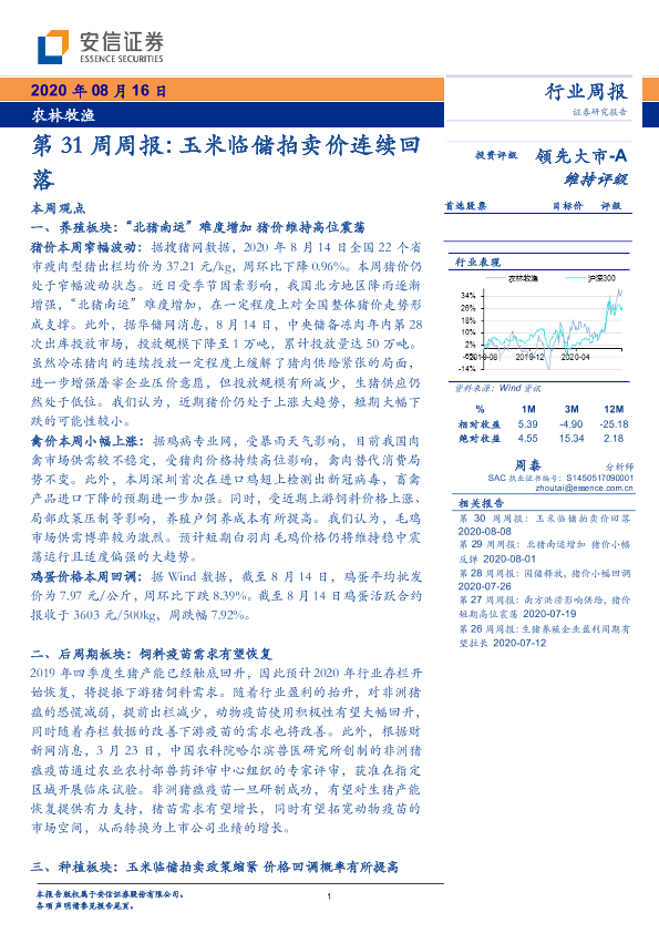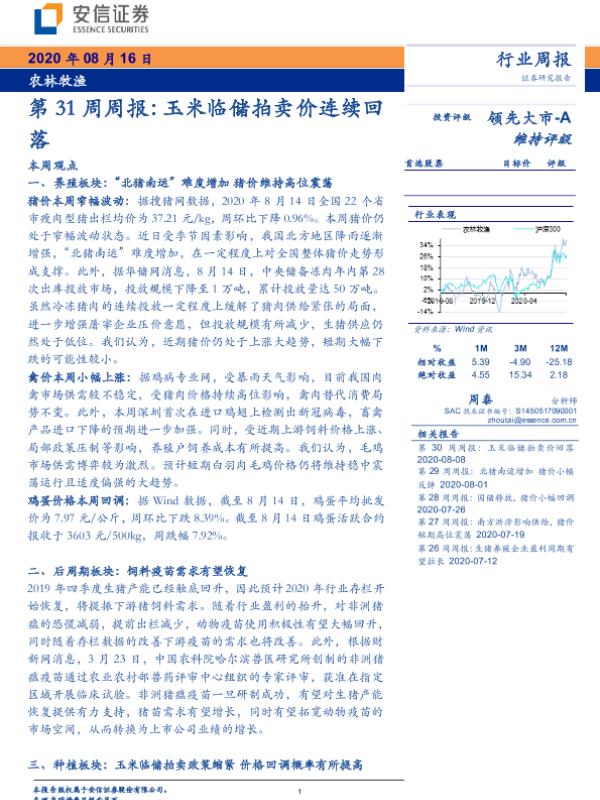 【安信证券】【20200816】20200816-安信证券-农林牧渔第31周周报:玉米临储拍卖价连续回落-23页