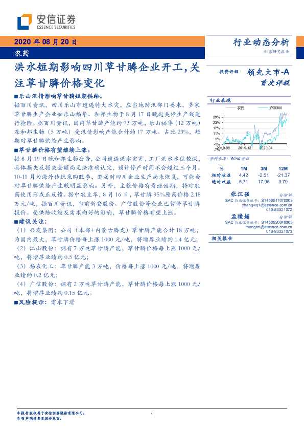 【安信证券】【20200820】洪水短期影响四川草甘膦企业开工,关注草甘膦价格变化-3页
