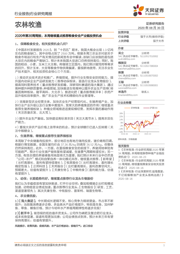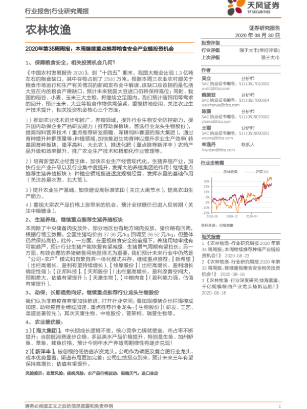 【天风证券】【20200830】2020年第35周周报:本周继续重点推荐粮食安全产业链投资机会-15页