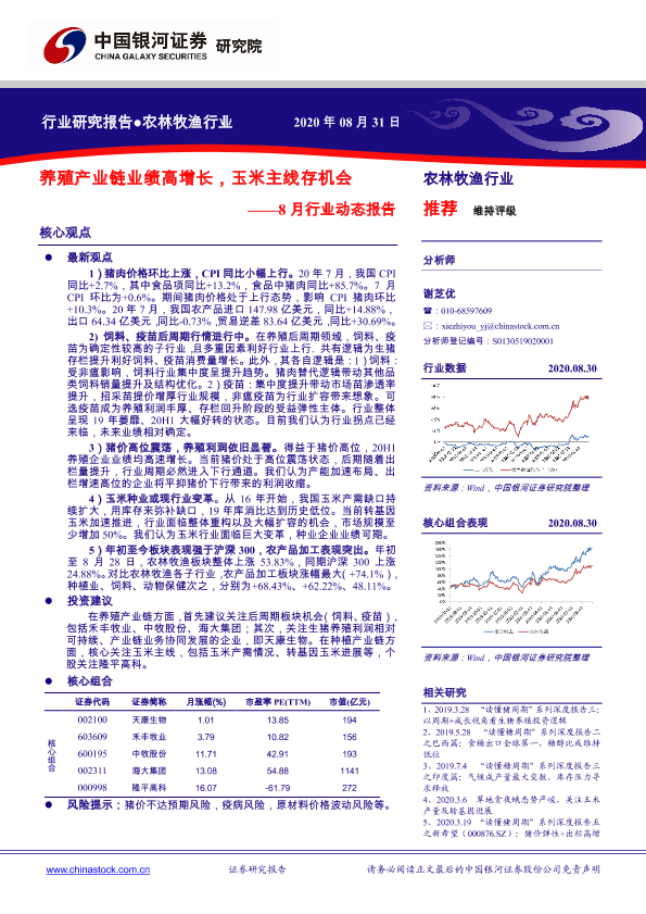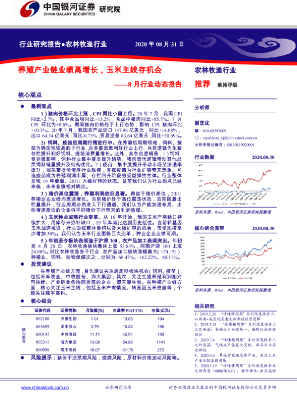 【银河证券】【20200831】20200831-中国银河-农林牧渔行业8月行业动态报告:养殖产业链业绩高增长,玉米主线存机会-28页