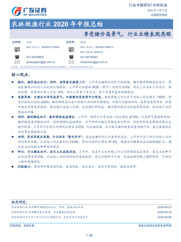 【广发证券】【20200903】农林牧渔行业2020年中报总结:享受猪价高景气,行业业绩表现亮眼-20页